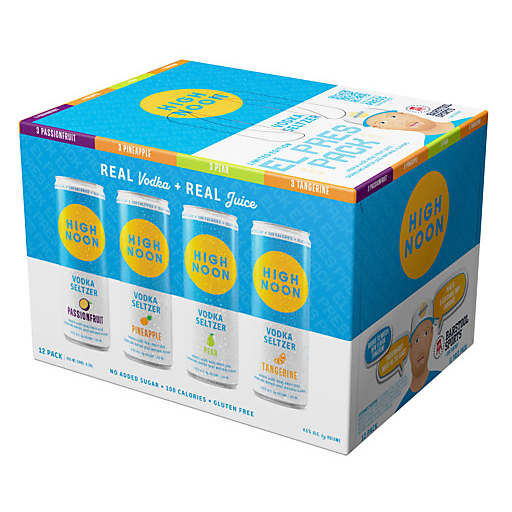 Made with real vodka & real juice, the High Noon Vodka Hard Seltzer El Pres Pack features the top 4 High Noon Vodka Seltzer flavors in the well-known “power rankings” of Dave Portnoy’ aka “El Pres”. Each 12 Pack comes with 3 cans of each flavor: Passionfruit, Pineapple, Pear, and NEW FLAVOR, Tangerine. Each can is 12 oz (355mL). Pick up a variety 12 pack of High Noon for good, flavorful, easy times with friends. Take a sip and find out why High Noon has been rated the Best Tasting Hard Seltzer in America. Only 100 calories, no added sugar and gluten free.