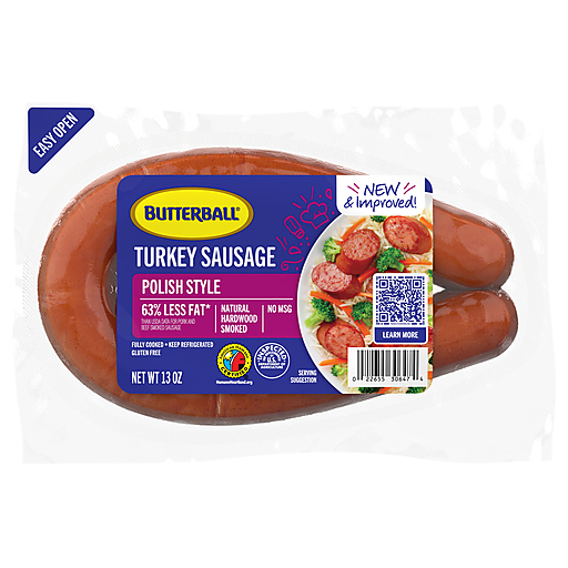 Experience the deliciousness of our Butterball Fully Cooked Polish Style Turkey Sausage. These ready-to-eat turkey kielbasa sausages boast a robust, smoky flavor infused with classic Polish seasonings that will delight your palate. Each serving contains 7 grams of protein and 63% less fat than traditional pork sausage*. We've also reduced the sodium compared to our previous recipe, so you can enjoy the same great taste with even more peace of mind. Versatile and flavorful, these Polish sausages are perfect for various recipes, from protein-packed breakfast skillets and hearty soups to pasta dishes and BBQ favorites. Gluten-free and free from MSG, our smoked turkey sausage links are crafted with you and your family in mind. Elevate your meals with Butterball Fully Cooked Polish Style Turkey Sausage because today, we turkey. *Than USDA data for cooked pork sausage.
