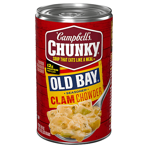 Campbell's® Chunky® OLD BAY® Seasoned Clam Chowder combines hearty New England Clam Chowder with OLD BAY® Seasoning for a bold, rich and flavorful way to satisfy your appetite. A tasty spin on a classic comfort food, this soup is seasoned with OLD BAY® seafood spice and crafted with generous pieces of succulent clam and hearty potatoes. Each can has 12 grams of protein*. It Fills You Up Right®. Just pop this soup into a saucepan or microwave-safe bowl, heat and enjoy. Or, heat it over the campfire on your outdoor adventures. Kick it up a notch by pouring this hearty chowder into a bread bowl. Whether you’re looking for quick and easy microwave soups for home or something to take on the go, Campbell’s® has you covered. The soup can is recyclable for easy disposal. Take on the great outdoors with Campbell's® Chunky® OLD BAY® Seasoned Clam Chowder—Soup That Eats Like a Meal®.