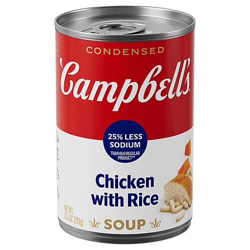 Cozy up with a steamy bowl of Campbell’s® Condensed 25% Less Sodium* Chicken and Rice Soup. With 25% less sodium than our regular Chicken and Rice Soup,* this chicken soup is crafted with golden chicken stock, rice, carrots and tender chicken meat with no antibiotics. The result is a soul-warming chicken with rice soup that brings a smile with every spoonful. Customize it with your favorite toppings, season it with fresh herbs, or pair it with apple slices. This convenient canned soup is a year-round pantry staple and the perfect comfort food on a chilly day or when you’re feeling under the weather. Simply mix the condensed soup with 1 can of water and microwave on high for 2.5 to 3 minutes in a covered microwave-safe bowl, or heat in a pot on the stove, stirring occasionally. Each 10.5 oz recyclable can contains about 2.5 servings of microwave soup. From Chicken with Rice to Cream of Mushroom and everything in between, Campbell’s® makes delicious soups in flavors your family knows and loves, with quality, farm-grown ingredients in every can. M’m! M’m! Good!® (*Contains 590mg sodium per serving vs. 790mg in our regular Chicken with Rice Soup)