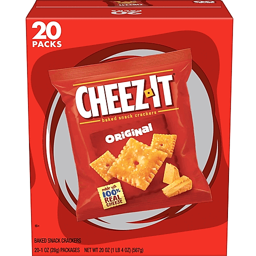 Outrageously cheesy and perfectly portable, these pouches of Cheez-It baked snack crackers contain deliciously crunchy little crackers that have captured cheese-lovers for decades. Discover a crowd-favorite snack made with 100% real cheese baked to crispy perfect for an irresistible taste in every crunchy bite. Each lightly salted crisp is loaded with a burst of cheesy flavor; Cheez-It baked snack crackers are an on-the-go fan-favorite for game night, school snacks, family movie nights, late-night snacking, and so much more, the cheesy options are endless. Delicious for all ages, grab a pouch of Cheez-It Original crackers for every family snacking moment. Whether you're packing them in school lunches, grabbing some for the office, or taking along on a road trip, you'll find a delicious, crisp snack that is filled with big cheese flavor. It’s no wonder that these bite-sized crackers have become a crowd-favorite, bringing smiles and that urge for just one more handful.