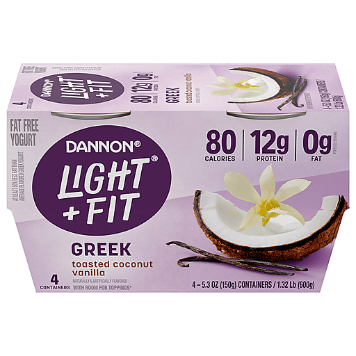 Looking for a delicious fat free yogurt with crave-able toasted coconut vanilla flavor? Give your taste buds a reason to rejoice with a four-pack of Dannon Light + Fit Toasted Coconut Vanilla Greek Fat Free Yogurt Cups.Every bite of this Toasted Coconut Vanilla flavored yogurt makes it easy to enjoy fat free snacks with this delicious light yogurt brand*. At Light + Fit, our goal is to help you do you by serving up some delightfully creamy Greek yogurt with sensational flavor. Our fat free Greek yogurt comes in single-serve cups, so you can live your life uninterrupted and enjoy them on the go. Protein is an essential nutrient we need in our diets, and with 80 calories and 12g of protein per 5.3 ounce serving, this Light + Fit yogurt is a deliciously satisfying and convenient option for adding complete protein every day. Pack a cup and enjoy it as a snack cup at work or as a late-night snack. Add a 5.3 oz yogurt cup to your breakfast parfaits and smoothies or use some in your favorite recipes as a flavorful substitute for baking ingredients. Plus, these Toasted Coconut Vanilla flavored 5.3 oz yogurt cups are perfect to enjoy as a protein-rich dessert or treat for any time. Add flavor to your day, every day, with a single serving snack cup of Dannon Light + Fit Toasted Coconut Vanilla Greek Fat Free Yogurt. *At least 50% less fat than average flavored Greek yogurt; Light & Fit: 80 calories, 0g fat; Average flavored Greek yogurt: 110 calories, 1g fat per 5.3 oz serving. **Consult your Healthcare Professional to learn how Light & Fit Greek yogurt can be included as part of a balanced diet.