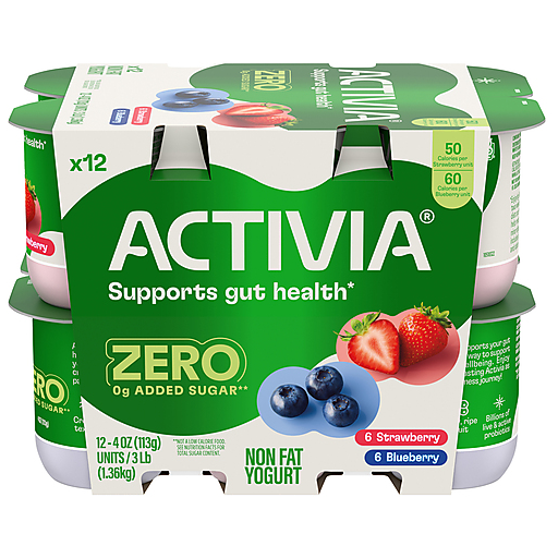 Start your day the smart way with Activia Zero 0g Added Sugar* Strawberry and Blueberry Probiotic Nonfat Yogurt. Delicious, creamy and full of flavor, each strawberry and blueberry yogurt cup has 0 grams of added sugar,* 0 grams of fat, and 50 calories per serving. Each serving of Activia yogurt is packed with our proprietary blend of live and active cultures and our exclusive probiotic, Bifidobacterium lactis DN 173-010/CNCM I-2494, which has been studied and shown to survive passage through the gastrointestinal tract. Probiotics are living microorganisms that provide specific health benefits, including supporting gut health.*** These probiotic yogurt cups contain essential nutrients and are a good source of vitamin D and calcium.** Making Activia probiotic yogurt a part of your day is an easy way to help support your gut health.*** Enjoy these 0g added sugar yogurt cups any time – they are great for breakfast, grab and go snacks, or as an addition to your midday yogurt smoothie. Your gut is where it all begins. Start with Activia Zero 0g Added Sugar.* *Not a low calorie food. See nutrition facts for total sugar content. **Contains 10% DV of calcium and vitamin D per serving. ***Enjoying Activia twice a day for two weeks as part of a balanced diet and healthy lifestyle may help reduce the frequency of minor digestive discomfort, which includes bloating, gas, abdominal discomfort, and rumbling.