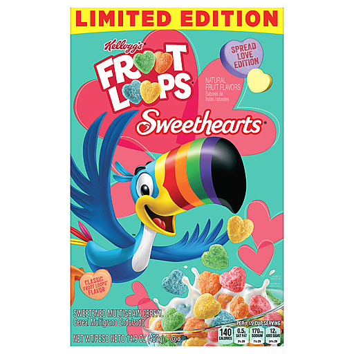 Follow your nose to delicious bursts of fruity flavor in Kellogg's Froot Loops Sweethearts multi-grain breakfast cereal. Perfectly sweet for Valentine's Day breakfast, dig into vibrant crunchy heart-shaped pieces made with tasty, natural fruit flavors and grains. It's like a heart-shaped rainbow in every bowl. Fun to eat for adults and kids, this healthy cereal is a good source of 9 vitamins and minerals per serving; The entire family can enjoy a bowl with milk or a dairy alternative in the morning, afternoon or as a late-night treat. Enjoy sweet cereal milk after a delicious bowl of Froot Loops cereal. Perfect for Valentine's Day festivities, Valentine's Day classroom parties, Galentine's Day, or for simply celebrating the holiday. Always have this sweet cereal handy, add fruity goodness to any lunch box, tote bag, or backpack. Any time you want to include a flavorful pick-me-up in your day, reach for a box of Kellogg's Froot Loops Sweethearts cereal.