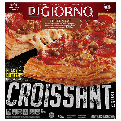 Enjoy the flaky, buttery layers of a croissant and your favorite meat lover’s pizza toppings with the DiGiorno® Three Meat Croissant Crust Pizza. This frozen pizza crust turns golden brown, airy, and tender like the inside of a freshly baked croissant. Every croissant pizza slice is covered in deliciously zesty tomato sauce and real mozzarella cheese. To top this DiGiorno® frozen pizza off, we’ve added a flavorful trio of chewy pepperoni, seasoned sausage pieces, and savory beef crumble. Keep this pizza frozen until you’re ready to enjoy, cook at 400°F for twenty minutes, let stand, then grab a slice! And if anyone asks -- it’s not delivery, it’s DiGiorno® pizza.