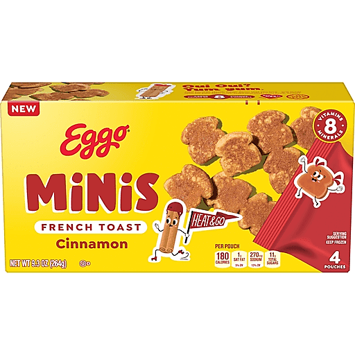 Wake up and get your day started with the deliciously decadent taste of Eggo Minis Cinnamon Frozen French Toast. For a quick part of a breakfast on the go, these pull-apart French Toast bites are packaged in a heat-and-serve pouch. Simply pop the pouch in the microwave or place the frozen French Toast in the toaster. They're just the right size for small hands; Great for families or for a solo snack. These delicious bites are delightful on their own or with your favorite toppings like butter, syrup, jellies, preserves, fruit, and whipped cream. Each serving is a good source of 8 vitamins and minerals and contains no artificial colors or flavors. Not just for breakfast, Eggo Minis French Toast can be enjoyed as an afterschool snack, late-night treat, or as a tasty grab-and-go when you're on the move. The pouch is ready to heat and eat - no fork, plate, or syrup needed! They're just so delicious, would you L'Eggo your Eggo?