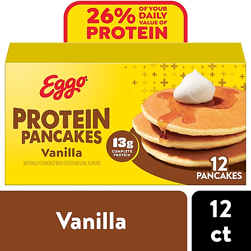 Eggo with an extra punch! Kickstart your day with a protein-packed breakfast with Eggo Protein Vanilla Pancakes. Crafted with delicious ingredients, you'll love the feel-good taste and decadent flavor of vanilla in every bite. Protein never tasted this good. They're your fave Eggo pancakes on a whole new level! Each serving of Eggo Protein Vanilla pancakes offers 13g of complete protein (complete protein contains all 9 essential amino acids in the recommended amounts per gram of protein, 26% daily value); Great for kids, busy teens, and adults, these protein-packed pancakes are made to enjoy as a part of a balanced breakfast. Pair with your favorite toppings like butter, syrup, fruit, or hazelnut spreads. Not just for breakfast, they make a warm, comforting afternoon treat, easy late-night bite, or a quick snack everyone will love. They are a delicious, protein-rich way to help amp up your day on their own or with your own spin. Give these leveled-up pancakes a try!