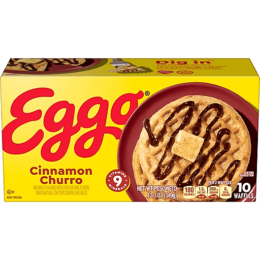 Wake up and greet the day with the feel-good taste of Kellogg's Eggo Cinnamon Churro waffles. Crispy and fluffy, our Eggo waffles are crafted with delicious ingredients for part of a quick and easy breakfast. Pop these decadent cinnamon waffles in the toaster or oven for a delightfully crisp texture and the familiar, inviting taste of warm churros. These tasty frozen waffles provide a good source of 9 vitamins and minerals per serving; Conveniently packaged and easy to prepare, Kellogg's Eggo waffles help bring warmth and smiles to fast-paced, busy mornings. Great for families and individuals alike, these rich waffles are made to enjoy as part of a balanced breakfast. Try them with your favorite morning toppings, such as butter and syrup, jellies and jam, peanut butter, hazelnut spread, fresh fruit, berries, whipped cream, and powdered sugar. They're just so delicious, why would you L'Eggo your Eggo?