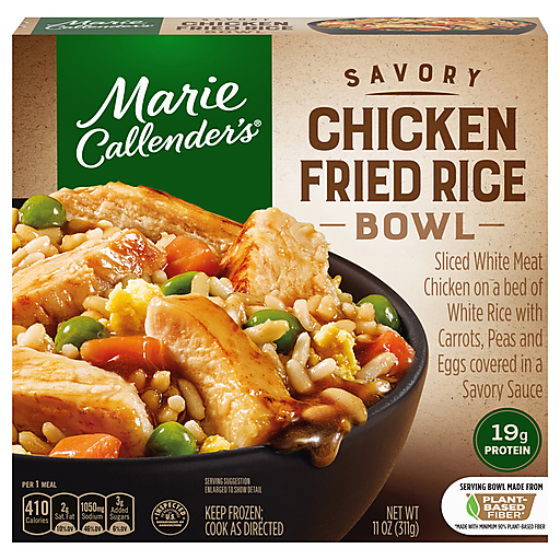 Put the taste of homemade flavor on your table with a Marie Callender's Savory Chicken Fried Rice Bowl. Marie Callender's Bowls offer convenient microwavable meals that are warm, hearty and delicious to satisfy your craving for a savory meal. Featuring sliced premium white meat chicken breast on a bed of white rice with crisp carrots, peas and eggs mixed in a savory garlic-ginger soy sauce, this frozen chicken fried rice bowl offers a savory taste you're sure to love. Made with wholesome ingredients, no preservatives and no artificial colors or flavors, this fried rice with chicken meal contains 19 grams of protein per serving. Whether you're feeding yourself or the whole family, Marie Callender's frozen bowls and frozen dinners are perfect quick meals for any occasion. Enjoy the combination of warm, hearty and delicious ingredients in Marie Callender's frozen meals for a homemade, comfort food taste.