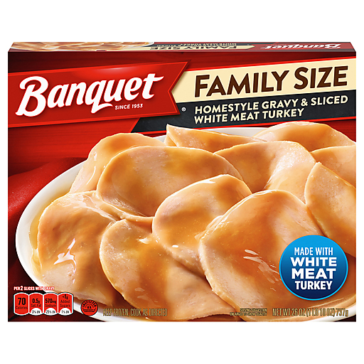 With quality, mouthwatering ingredients, a great frozen meal option is just minutes away with Banquet Family Size Homestyle Gravy and Sliced White Meat Turkey. Satisfy your family's turkey dinner cravings with this family size frozen food meal of tender, sliced white meat turkey with homestyle gravy. Made with wholesome ingredients, these turkey slices make easy, ready made meals for the family any day of the week. Serve turkey with mashed potatoes and corn. Preparation of frozen family meals is easy in the microwave or the oven. Just heat frozen turkey according to the instructions on the package for prepared meals ready in minutes. Store this family size frozen meal in the freezer until ready to prepare. in the U.S.A. for over 60 years, Banquet has been making delicious food the whole family loves.