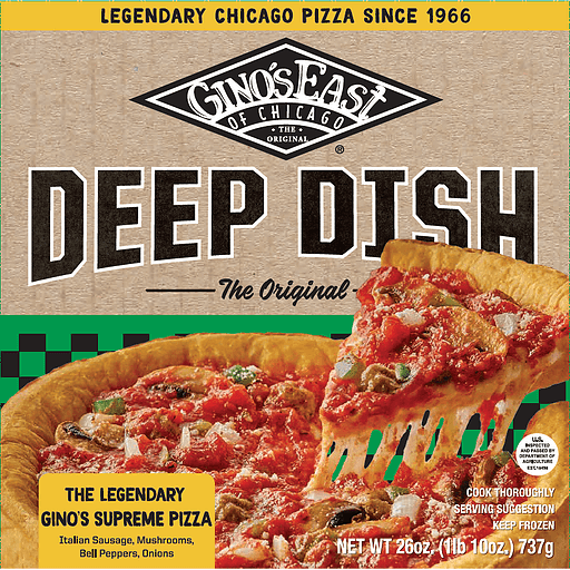Authentic. The Original. Serves up to 4. Pop - up timer include. Bake perfect pizza. U.S. Inspected and passed by Department of Agriculture. Crumbled sausage, green peppers, onions & mushroom. For over 40 years, Gino's East of Chicago has been serving up legendary deep - dish pizza to Chicagoans and worldwide visitors at their landmark downtown Chicago eatery. Generations of patrons have savored the abundance of fresh toppings, cheese, signature sauce & spices surrounded by Gino's East famous golden crust. Now you can enjoy that same eating experience at home with Gino's East frozen deep - dish pizza. Follow the baking instructions utilizing the convenient pop - up timer for perfect pizza. Enjoy all the delicious varieties of Gino's East authentic Chicago deep - dish pizza.