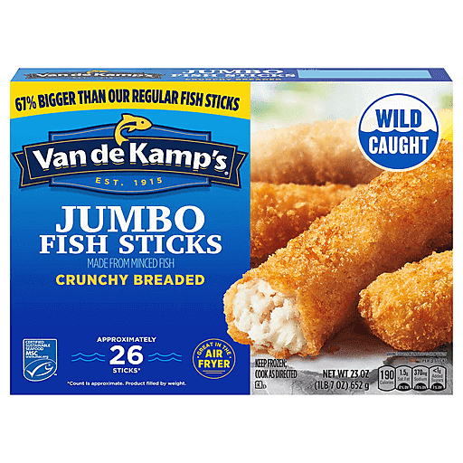 When you want even bigger delicious, crispy fish sticks, reach for Van de Kamp's Crunchy Breaded Jumbo Fish Sticks. This mouthwatering, wild-caught pollock is surrounded by a golden breading that is the perfect combination of flavor and crispiness. Whether you are adding them to your favorite fish taco recipe, dipping them in tartar sauce or simply eating them all by themselves, you will love these tasty fish sticks. Easily prepared in the air fryer or the oven, they're a natural source of Omega-3s*, are a good source of protein, with 8 grams per serving, and are certified sustainable seafood** so you'll feel good about what you're feeding your family.