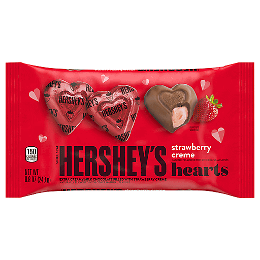 Treat your loved ones this Valentine's Day with HERSHEY'S extra creamy milk chocolate hearts filled with strawberry flavored creme. Perfect for lunches, snack breaks, movie nights and sharing moments throughout the season, this chocolate candy is crafted with extra creamy milk chocolate and smooth creme for rich, delicious flavor in every bite. Each heart comes individually wrapped in Valentine's Day foil, providing an eye-catching focal point for any loving celebration. Prepare party favors and gift bags with holiday inspired HERSHEY'S chocolates, or pass these extra creamy milk chocolate snacks out at the office to add some excitement to your traditions. Bring a bag of HERSHEY'S strawberry flavored creme flavored hearts candy to your next movie night with friends, family members or co-workers for a shareable candy snack even Cupid would approve of. No matter who you want to treat this Valentine's Day, HERSHEY'S hearts candy has it covered. If you're looking for a more creative option, try bringing these strawberry flavored creme chocolates into the kitchen by placing them on top of your best cookies, brownies, cupcakes or pies. Let cool, serve to loved ones and wait for the recipe requests to pour in. Just don't forget to save some chocolate candy hearts for yourself during all of that sharing!