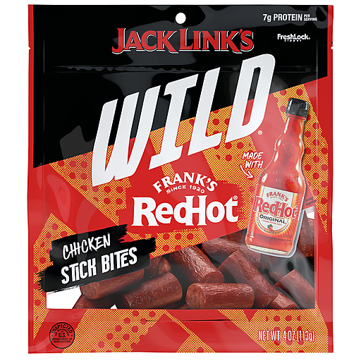 Snack wildly with the perfect blend of flavor & heat. Jack Links Wild x Franks RedHot Chicken Stick Bites pack 7g of protein, 80 calories per serving, and endless boldness into every bite.