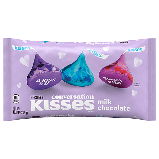 This HERSHEY'S KISSES milk chocolate candy is the delicious chocolate treat you've always loved wrapped in fun Valentine's Day conversation foils that are ready for gifting. Enjoy the decadent taste of smooth, creamy bite size chocolate pieces anywhere and at any time. Filled with HERSHEY'S KISSES Valentine's Day candy dressed for the holiday in pink, purple and blue conversation foils, this bag of milk chocolate candy is the perfect gift for loved ones for a special way to celebrate your love. Share these individually wrapped treats with friends and family members or bring a bag with you to your next movie night or celebration. This festive bag of chocolates is full of individually wrapped candy, so you can gift the whole bag or hand HERSHEY'S KISSES treats out separately to start conversations with everyone on your list. Stock your candy dishes, fill your snack cabinet, take a bag to the office, or decorate for Valentine's Day with colorful, conversation starting foil wrapped candies suited for any celebration. Spruce up your baked goods by adding HERSHEY'S KISSES candy on top of cookies, brownies, cupcakes and more — no matter how you use them, these creamy milk chocolate treats will make the day sweet for everyone involved.