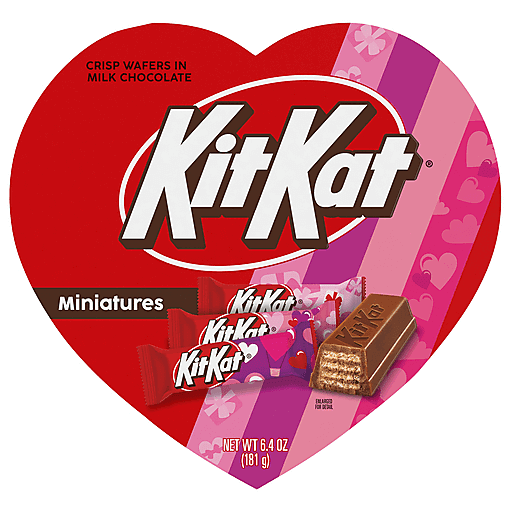 If you want a milk chocolate treat to show how much you care on Valentine's Day, this gift box of KIT KAT® Miniatures candy bars comes individually wrapped for optimal convenience, easy sharing and lasting freshness. Break it open and share these bite size bars with everyone to give your nearest and dearest the gift of deliciousness. These certified kosher milk chocolate bars are packed in a festive Valentine's Day gift box and is perfect for candy exchanges. Don't forget to hold onto a few for your Valentine's Day baking recipes. Use KIT KAT® milk chocolate wafer bars for topping any cupcakes, cookies or brownies you bake for the season and watch as your recipe becomes the crowd favorite at this year's Valentine's Day party! Getting ready for a Valentine's Day movie night? Add some KIT KAT® crispy wafer bars coated in creamy milk chocolate for an extra special touch that satisfies the whole crowd. You can snack on these milk chocolate bars straight from the wrapper, chill them in the fridge or freezer for a cold treat or add them to your ice cream sundae toppings bar. No matter what you decide, it's bound to be a delicious success!