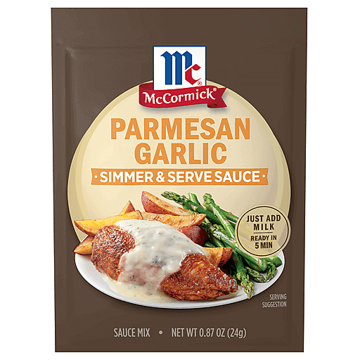 McCormick® Parmesan Garlic Sauce Mix helps you break out of your dinner rut with a sauce so versatile that it goes great over chicken, steak, pasta, rice, potatoes and veggies. This 5-minute sauce delivers the perfect finish to any meal. No special ingredients or long cooking needed with our Parmesan Garlic Sauce Mix. Simply whisk the sauce mix packet with 1 cup milk in a saucepan. Bring to a boil then simmer for 2 minutes. The result is 1 cup of sauce to serve over simply cooked entrees of poultry or meat. With its alfredo-inspired flavors of Parmesan cheese and garlic, it's also delicious over shrimp or other seafood as well as kid-friendly spaghetti. Sometimes you all you need is a sauce to add flavor excitement to dinnertime.