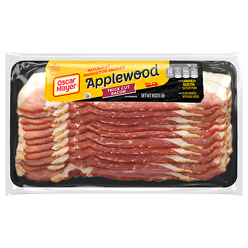 Oscar Mayer Naturally Hardwood Smoked Applewood Thick Cut Bacon Slices deliver a smoky bacon flavor that crisps up in minutes. Naturally smoked with real applewood for a premium taste with hints of subtle sweetness, our bacon is made from carefully selected, hand-trimmed cuts of pork. Serve our naturally smoked Oscar Mayer thick cut bacon in the morning as part of a hearty breakfast of bacon and eggs, or to top your favorite dishes like salads and baked potatoes. Our applewood smoked bacon comes in a 16 oz vacuum sealed package so you'll have enough to serve friends and family with the smoky flavor of America's favorite bacon. Keep refrigerated and use within seven days of opening.