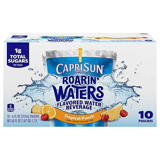Splash into hydration! Capri Sun Roarin’ Waters Tropical Punch Flavored Water Beverage makes it easy to help kids stay hydrated. Our formula is sweetened with stevia and sugar. Tropical Punch features the tart essence of pineapple, orange and cherries. Always a kid's favorite, our flavored water is so tasty even parents can't resist sneaking a pouch or two! Capri Sun Roarin' Waters Tropical Punch Flavored Water Beverage comes in the iconic Capri Sun 6 fluid ounce pouch so it’s easy to help kids stay hydrated at school, on the playground or during practice. Each box contains 10 convenient pouches of fruity flavored water.