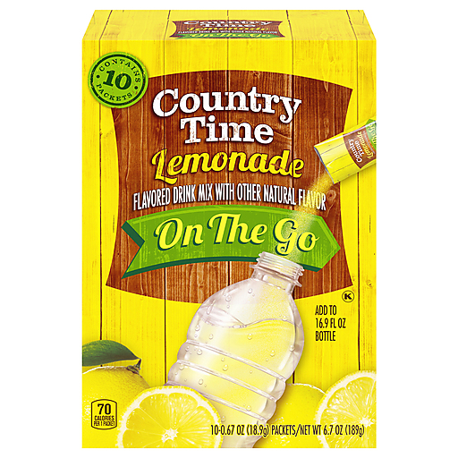 Country Time Lemonade Naturally Flavored with other natural flavor On-The-Go Powdered Drink Mix helps make it feel like summertime anytime, anywhere. Refreshing lemonade is great to help quench your thirst on summer days. Our lemonade has the ideal balance of sweet and tart to deliver the old-fashioned, crisp lemonade you love. Convenient for quick-mixing any time of day, our caffeine-free and kosher lemonade on-the-go packets have no artificial flavors. Store packets in a backpack, gym bag, briefcase, or wherever you want for easy mixing on the go. Individually portioned, our drink mix packets are perfect for adding to a standard 16.9 fl oz water bottle. Add one lemonade mix packet to a bottle or tall glass of water, then shake or stir for fruity flavor at your fingertips. Each box contains 10 packets, each with 0.67 ounces of lemonade mix. From afternoon pick-me-ups to pre-workout refreshers, enjoy the taste of summer any time with Country Time Lemonade On-The-Go Powdered Drink Mix.