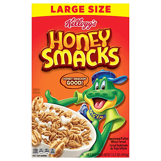 A cereal you can dig, Kellogg's Honey Smacks makes for an indulgent treat. Each piece of puffed wheat has been enhanced with the delicious taste of honey, making Kellogg's Honey Smacks a great way to satisfy your sweet tooth. This wholesome cereal is crafted to help bring energy to your mornings with whole grain and no high fructose corn syrup. Not just for mornings, Kellogg's Honey Smacks is a tasty addition to any meal or snack any time of the day. Enjoy as a well-deserved treat at the office, take in an afternoon pick-me-up, reenergize with a post-workout bite, and indulge in a late-night bowlful of sweet, crunchy cereal. Kellogg's Honey Smacks also makes a scrumptious addition to homemade trail or party mix; the delicious options are endless. A travel-ready food, this cereal is perfect to pack in lunchboxes, for after-school snacks, sporting events, and busy, on-the-go moments. Just add your favorite dairy or nut-milk or enjoy as a crispy treat straight from the box.
