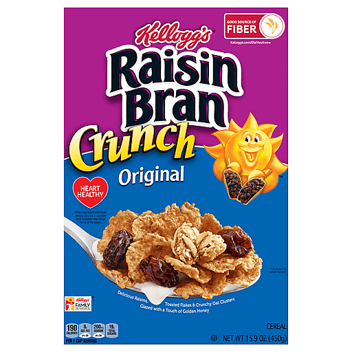 Wake up with Sunny and the simple goodness of Kellogg's Raisin Bran Crunch, a deliciously crafted, wholesome breakfast cereal that helps energize the start of your day. This satisfyingly crunchy cereal is made with crispy, toasted flakes balanced with the satisfying taste of sweet raisins in every spoonful. Raisin Bran Crunch provides a good source of fiber and six vitamins and minerals to help you start your day off strong; Just as nutritious as it is delicious, this cereal is heart-healthy (while many factors affect heart disease, diets low in saturated fat and cholesterol may reduce the risk of this disease). Whether you enjoy this healthy cereal in a bowl with your favorite milk for a quick breakfast, sprinkled over yogurt for an afternoon treat, or as a crispy snack straight from the box after your workout, Kellogg's Raisin Bran Crunch cereal lets you rise, shine and make the most of your day.?