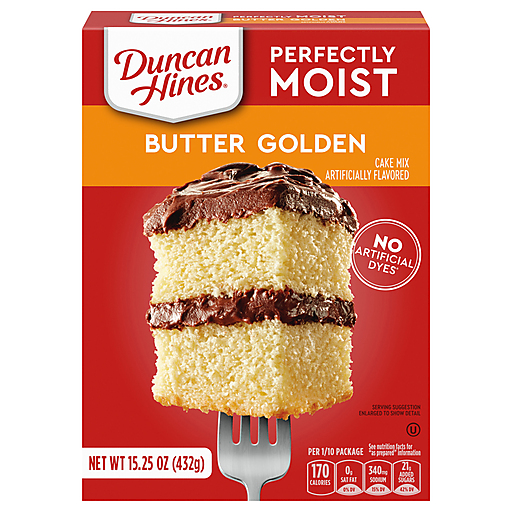 Duncan Hines Perfectly Moist Butter Golden Cake Mix makes a moist and delicious butter golden cake that is sure to become a family favorite. The smooth and velvety cake batter makes it easy to bake a perfectly moist cake every time. Simply add water, eggs and butter to the baking mix and stir to combine. Pour into a pan and bake for the recommended time in the instructions. Prepare this butter golden cake mix to make a decadent layer cake with frosting or add sprinkles for a festive birthday cake. You can also use it as a cupcake mix, or to make fun cake creations like cake pops. This certified Kosher boxed cake mix makes one 8 or 9 inch layer cake, one 13 x 9 inch sheet cake or 24 cupcakes. From birthday cake to single serve desserts, Duncan Hines has you covered when you're ready to bake and create. Bake someone happy!