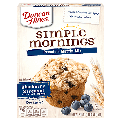 Duncan Hines Simple Mornings Blueberry Streusel Premium Muffin Mix makes wholesome and delicious muffins the whole family will enjoy. Loaded with fruity flavor, these naturally flavored blueberry muffins are made with whole wheat flour, real blueberries and a sweet crumb topping for a delightful start to your day. Simply add water, eggs and oil to the baking mix and stir to combine. If desired, fold fresh, rinsed and drained blueberries into the batter, pour into a pan, top with streusel and bake for the recommended time in the instructions. Prepare this muffin mix for a quick breakfast any day of the week or use it to make mini blueberry muffins for sweet snacks after school. This muffin mix is made with no high fructose corn syrup, no preservatives and 0 grams of trans fat per serving, so you can feel good about the baked goods you serve. Each package makes 6 jumbo muffins, 12 regular muffins or 36 mini muffins. From breakfasts to just-because sweet treats, Duncan Hines has you covered when you're ready to bake and create. Bake someone happy!