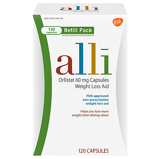 alli (orlistat 60 milligram capsules) is your smart edge for weight loss. Among weight loss products, it’s the only FDA-approved over-the-counter weight loss aid. Orlistat, the active ingredient in alli, is a lipase inhibitor and works by binding to specific enzymes that break down fats. As a result, about 25 percent of the fat you consume is not absorbed and passes through the digestive system. Since the calories associated with this unabsorbed fat are not used, the number of calories that enter your system is reduced. You’re ready with alli by your side. alli (orlistat 60 milligram capsules) is a weight loss aid for overweight adults, 18 years and older, when used along with a reduced-calorie and low-fat diet. Read and follow label directions.alli orlistat 60 mg capsules weight loss pill refill pack (120 capsules) contains: A read me first brochure and up to 40-day supply. It is designed for people who are already using alli and have previously purchased the starter pack. Helps you lose more weight than dieting alone. Read the enclosed brochure for other important information. Diet and exercise are the starting points for any weight loss program.