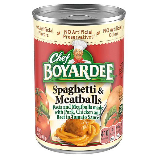 Chef Boyardee Spaghetti and Meatballs is a delicious and convenient prepared meal that is ready to eat in minutes and has delighted families for generations. Made with enriched pasta noodles, rich, Italian-flavored tomato sauce, and tasty meatballs made with pork, chicken and beef, this canned food has the timeless flavor everyone loves. Made with no artificial flavors, colors or preservatives, this iconic pantry staple makes a wholesome meal for kids of ALL ages. When you need a quick stove top or microwave meal, grab a can of spaghetti and meatballs and in just a few minutes, dinner is ready to serve. Perfect for office or school lunches, easy dinners, or quick and filling snacks, Chef Boyardee pasta provides that time-tested taste your family loves.