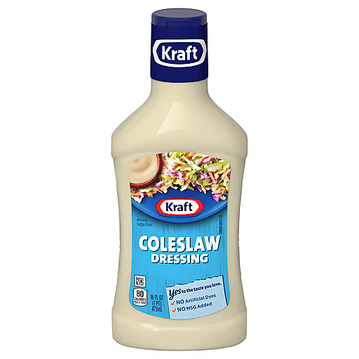 Kraft Coleslaw Dressing makes it easy to quickly create the perfect homemade coleslaw. Our tangy coleslaw dressing always makes an appetizing side for all your barbecues. At 80 calories per serving, no artificial dyes and no MSG added, you can feel good about serving our dressing. Top all your favorite slaw recipes with our creamy dressing, or use it for great dishes like broccoli slaw. Kraft Coleslaw Dressing comes in a sealed 16 fluid ounce bottle to preserve freshness and is best enjoyed after shaking. Store the creamy slaw dressing in the fridge after opening.