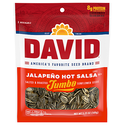 DAVID Jalapeno Flavored Salted and Roasted Jumbo Sunflower Seeds are delicious sunflower seeds that are fun to eat anytime, anywhere and are bigger than the normal sized DAVID sunflower seeds. Unlike other jalapeno sunflower seeds you've tried, these jumbo sunflower seeds are full of that salted and roasted flavor you've come to expect from DAVID with the added spicy sensation of jalapeno flavoring to fire up your taste buds. Crack open the shells, discard the shells and enjoy seeds! These flavored sunflower seeds are gluten free snacks, made with no artificial flavors, are keto friendly (7g of protein, 3g net carbs [5g total carbs minus 2g dietary fiber], and 0g added sugar per serving) and fit a low carb lifestyle (3g net carbs per serving [5g total carbs minus 2g dietary fiber]). DAVID jumbo sunflower seeds are fun and engaging salty snacks to enjoy. DAVID seeds can help with mental focus during the work day or while studying for a test, they can help athletes stay alert during baseball and softball games, and they can help pass the time during long road trips or while watching a sporting event. These salted and roasted sunflower seeds are packaged in conveniently sized sunflower seed packets so you can take this snack with you wherever you go. DAVID is an American Original, salted and roasted sunflower seeds since 1926. They are delicious and fun to eat anytime, anywhere.