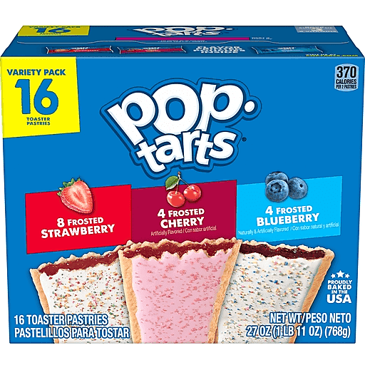 This variety pack of Pop-Tarts are a delicious treat to look forward to any time of day. Enjoy Frosted Strawberry, Frosted Cherry, and Frosted Blueberry flavors in this convenient variety pack box. Help jump-start your day with yummy filling encased in a pastry crust and topped with a layer of frosting. A quick and tasty anytime snack for the whole family, Pop-Tarts toaster pastries are an ideal companion for lunchboxes, after-school snacks, and busy, on-the-go moments; Not just for mornings, the versatile deliciousness of Pop-Tarts fits into your lifestyle just about anywhere there's time for a snack. Store them in your desk drawer for a pick-me-up at the office or keep them in your pantry for an after-dinner treat. Just pop them in your toaster for a crisp, warm crust, heat them in the microwave, or enjoy them straight out of the foil with a glass of ice-cold milk. They're perfectly frosted pockets of deliciousness. Go ahead, take a bite!
