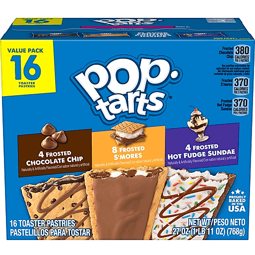 Pop-Tarts Frosted Chocolate Chip, Frosted S'mores, and Frosted Hot Fudge Sundae toaster pastries are a delicious treat to look forward to any time of day. Jump-start your morning with sweet chocolate-lovers flavors, all encased in a pastry crust and topped with yummy frosting. A quick and tasty anytime snacking option for the whole family, Pop-Tarts toaster pastries are an ideal companion for lunchboxes, after-school snacks, and busy, on-the-go moments; Not just for mornings, the versatile deliciousness of Pop-Tarts fits into your lifestyle just about anywhere there's time for a snack. Store them in your desk drawer for a pick-me-up at the office or keep them in your pantry for an after-dinner treat. Just pop them in your toaster for a crisp, warm crust, heat them in the microwave, or enjoy them straight out of the foil with a glass of ice-cold milk. These delectable toaster pastries are delicious to munch on wherever you go.