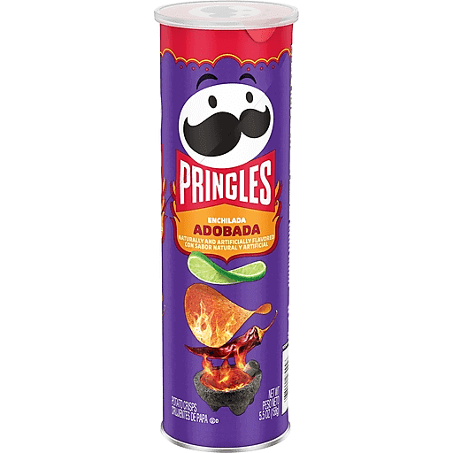 What happens when you combine the taste of spicy Mexican enchiladas with the light, crispy crunch of Pringles? You get a full-on kick of authentic flavor that's outrageously delicious. Each crisp brings a tongue-tingling taste of adobo, hot chili peppers, lime, and salt for a bold taste experience that hits the spot every time. Stacked in a convenient can, Pringles makes it easy to create your own snacking moments whenever and wherever life takes you; Stock your pantry with Pringles as tasty snacks for the whole family. Pop open a can to crank up the flavor when cranking up music or movies. Reach for some when watching sports or playing video games. Serve Pringles as the perfect party food when you're with friends. However you enjoy them, Pringles Enchilada Adobada Potato Crisps bring that tangy, mouthwatering heat that keeps you coming back, stack after stack.