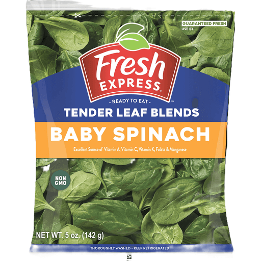 Thoroughly washed. Ready to eat. Baby Spinach is a good source of Vitamin A, Vitamin C, Vitamin K, folate & manganese. Vitamin A contributes to the maintenance of normal vision. Folate contributes to normal maternal tissue growth during pregnancy. Vitamin C contributes to normal collagen formation and the normal function of bones, teeth, cartilage, gums, skin and blood vessels. Vitamin K contributes to maintenance of normal bone. Low fat diets rich in fruits and vegetables (foods that are low in fat and contain vitamin A, vitamin C and dietary fiber) may reduce the risk of some type of cancer, a disease associated with many factors. Why we're so fresh: To guarantee Fresh Express Salads are consistently, deliciously fresh, we: Cool our salads within hours of harvest and keep them chilled from field to store. Thoroughly rinse and gently dry; then seal them in our keep-crisp bag to maintain freshness. Deliver fresh salad daily. Fruits & veggies more matters.