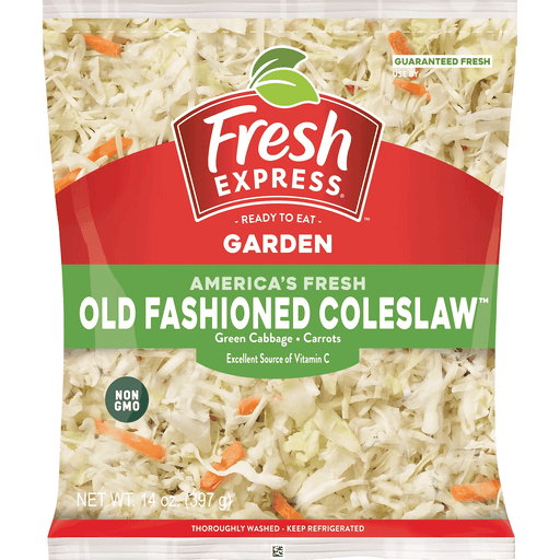 Green cabbage. Extra carrots. America's fresh. Excellent source of vitamin C. Guaranteed fresh. Thoroughly washed. Ready to eat. No preservatives. Old Fashioned Coleslaw is an excellent source of vitamin C. Vitamin C contributes to the reduction of fatigue. Low fat diets rich in fruits and vegetables (foods that are low in fat and contain vitamin A, vitamin C and dietary fiber) may reduce the risk of some types of cancer, a disease associated with many factors. Fruits & Veggies: More matters. Why we're so fresh! To guarantee Fresh Express salads are consistently, deliciously fresh, we: cool our salads within hours of harvest and keep them chilled from field to store; thoroughly rinse and gently dry; then seal them in our Keep-Crisp bag to maintain freshness; and deliver fresh salads daily. Fresh Promise Express: Fresh guaranteed! At Fresh Express, we are passionate about delivering the freshest, highest quality salads possible! Our team of food scientists and agriculture experts are committed to exceeding industry standards so we can guarantee the freshness of our salads, every single day. Questions? Comments? Call 1-800-242-5472 or visit www.FreshExpress.com. Slaws shreds. Get delicious recipes & more! Product of USA.