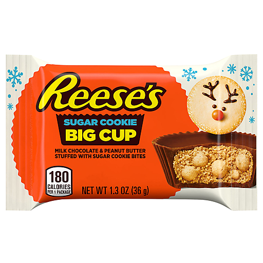 You can't beat this old fashioned, match made in heaven when it comes to creamy milk chocolate combined with delicious peanut butter, now stuffed with delicious sugar cookie pieces! REESE'S Big Cup Sugar Cookie Milk Chocolate Peanut Butter Cups are ready to be your go-to snack this holiday season. Bring this pack along to the next winter sporting event as a concession treat, during holiday movie marathons with friends and family or just to fill your candy dish all season long. Store them in your pantry for an anytime snack or slip a pack into lunch boxes and purses for a midday surprise. REESE'S Big Cup Sugar Cookie milk chocolate peanut butter cups are a sweet delight that you can bite, break, dunk or nibble on. Dunk them into a cold glass of milk, a cup of hot chocolate or your coffee to experience the melty goodness. Put a unique twist on classic baked goods like cookies, cupcakes and ice cream decadents with whole, halved or crumbled REESE'S cups with a sugar cookie twist. These peanut butter treats are kosher certified and go well with almost everything, especially during the holidays. Stuff Christmas stockings, gift a pack to the baker in your life or adorn your dessert trays with REESE'S Big Cup treats.