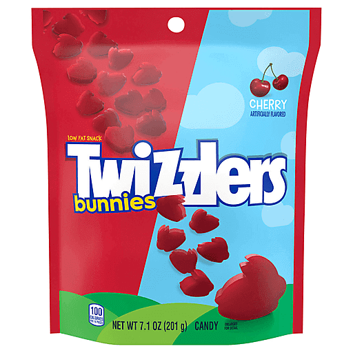Get in the Easter spirit with delicious bunny-shaped, fruit flavored chewy candies! These TWIZZLERS bite size, cherry flavored candies are shaped perfectly for all your Easter celebrations and traditions. Packaged in a bag for lasting freshness, you can enjoy them all season long! Pour these candies into a covered candy dish to set out while dyeing Easter eggs or have a bag ready for road trips, movie marathons and any moment in-between. Just don't forget to save some for yourself! In charge of bringing a festive dessert for Easter dinner? Bake and decorate a bunny-themed cake with these chewy, TWIZZLERS cherry flavored candies! Or, have the kids place individual cherry flavored bunnies on top of cupcakes, brownies and other desserts for a fruity addition to your favorite chocolatey desserts. You can also place entire bags of TWIZZLERS candy in Easter baskets for those in your family who enjoy cherry flavored sweets. As a low fat, kosher treat, TWIZZLERS Bunnies candy adds a little extra sweetness into your holiday celebrations, whether you eat them one by one or by the handful. And if you're in the sharing mood, pass this bag around so that everyone can enjoy some fruity bites of cherry flavored candies.