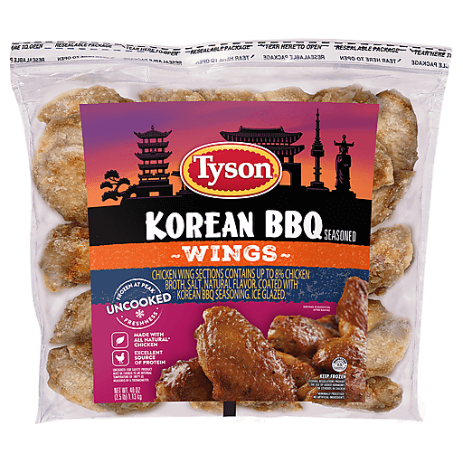 Enjoy bold flavor with Tyson Korean BBQ Frozen Chicken Wings. Our juicy Tyson chicken wings are made with all-natural* chicken and covered in tangy Korean barbecue seasoning. Prepare our frozen chicken wing sections on the grill, in an air fryer or in a conventional oven. Our wings are the perfect finger food for game day tailgates, parties and social gatherings with friends. Serve our chicken wings with a sesame soy glaze or Gochujang sauce for a quick and delicious appetizer, snack or part of a meal. Our chicken is raised with no added hormones or steroids. Each 4-ounce serving contains 16 grams of protein and 0 grams of trans fat. Keep our 2.5 pound resealable bag of Tyson frozen chicken wings frozen until ready to prepare. Ideal as an appetizer, snack or quick weeknight dinner, our flavorful chicken wings are sure to be a crowd-pleaser. Keep it real. Keep it Tyson. *Minimally processed, no artificial ingredients