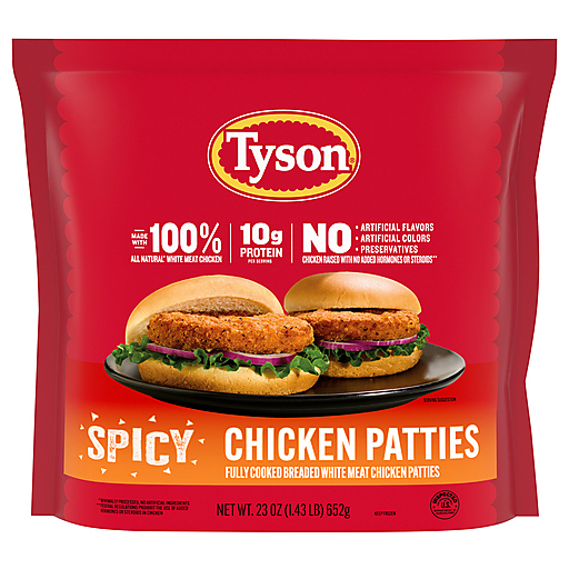 A spicy twist on a chicken staple, Tyson Frozen Spicy Chicken Patties are the spicy sandwich patties for at-home fun. These chicken patties are fully cooked, breaded, and made with white meat chicken for a tender and tasty patty. Perfect sandwiched between two buns, top the patties with traditional lettuce and tomato or get creative with sriracha to make the sandwich sensational. Whether cut up to put in a salad or enjoyed as a snack, these patties are made with 100% all-natural* chicken raised without added hormones or steroids**. Tyson Frozen Spicy Chicken Patties have 10 grams of protein per serving and are an easy-to-make option. Keep frozen until ready to prepare, then cook them in an air fryer, oven, or microwave according to the instructions on the back of the pack for warm and spicy chicken patties. *Minimally processed, no artificial ingredients **Federal regulations prohibit the use of added. hormones or steroids in chicken.